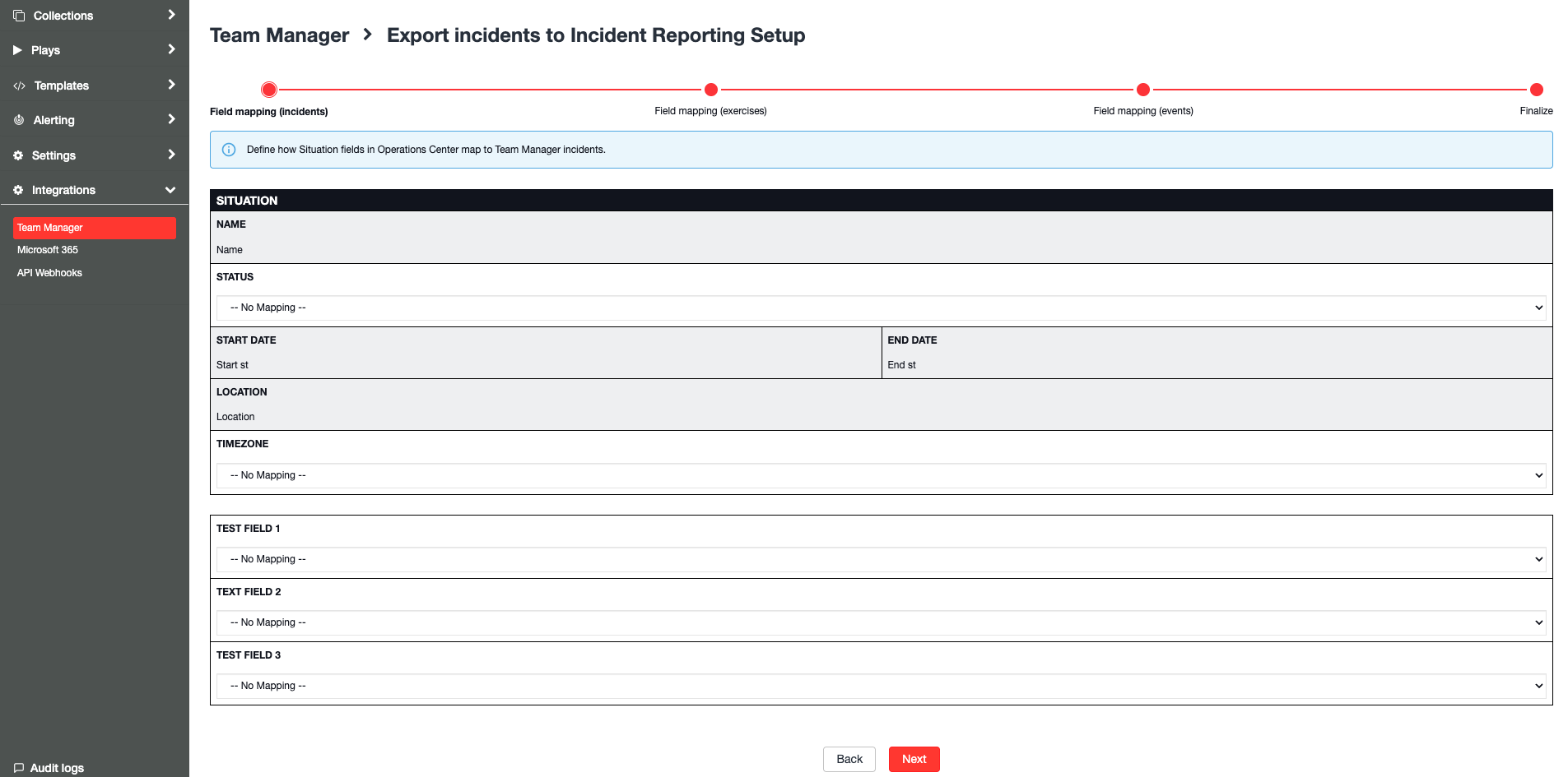 - Define how the Situation fields in Operations Center map to Team Manager incidents, exercises, or events.